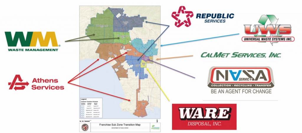 In 2017, the city of Los Angeles launched the RecycLA program. The program divided the city into different zones where all commercial and industrial businesses, as well as large multifamily buildings, were to be served exclusively by one waste collection company, also known as a franchise service provider.